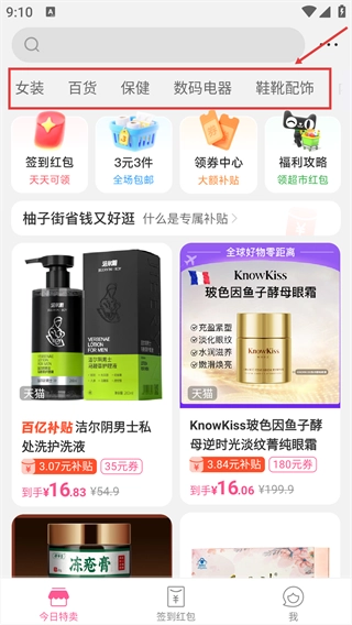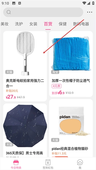 1、进入首页,可通过顶部【女装】【百货】等分类切换商品类目。