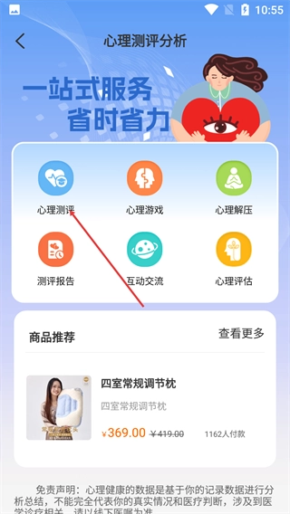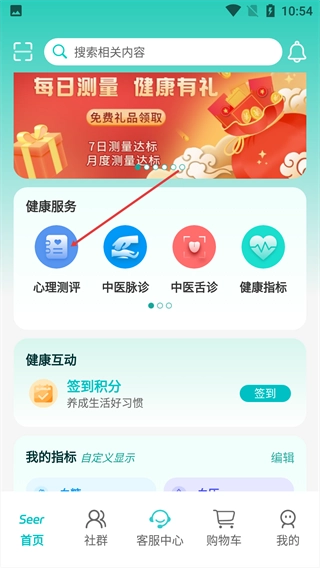 1、进入首页后,在健康服务板块点击【心理测评】功能。
