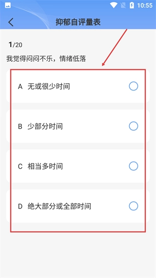 4、针对题目选择对应的选项,依次完成20道题的测评流程。