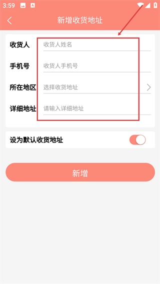 4、依次填写收货人、手机号、所在地区、详细地址等信息,完成后点击【新增】按钮,保存该收货地址。
