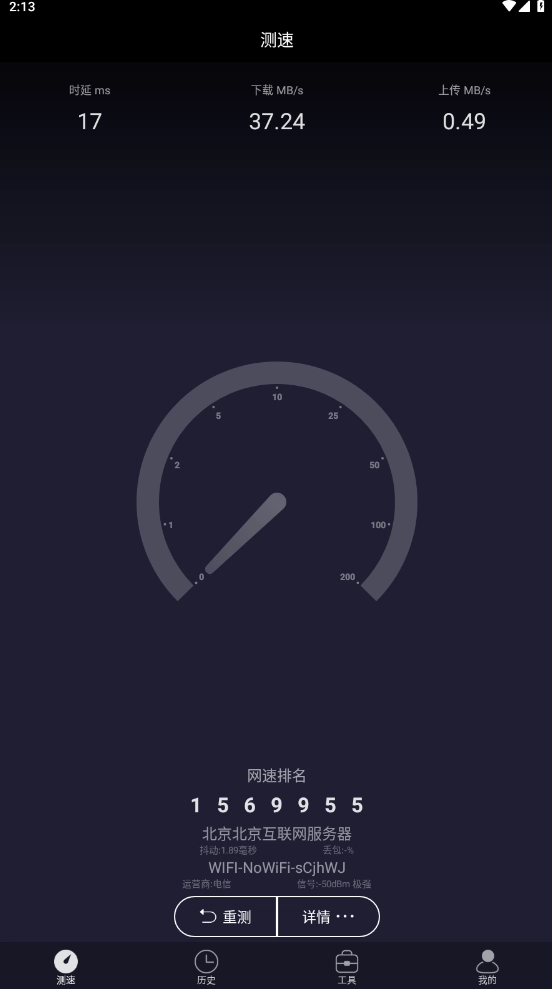 2、历史记录查看:可便捷查看您的测速历史数据,便于对每次测试结果进行对比分析。