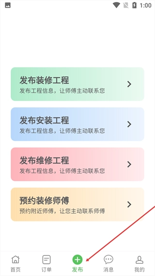 2、在发布页面中找到并选择【预约装修师傅】这一选项,即可进入师傅预约的操作界面。