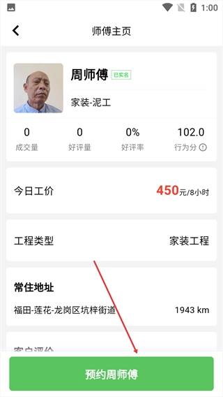 4、进入师傅主页,浏览完师傅的相关信息后,点击【预约周师傅】按钮,即可发起对该师傅的预约流程。