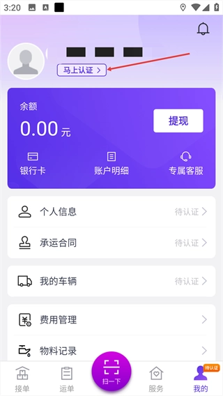 1、打开“我的”页面,点击头像旁边的【马上认证】按钮。