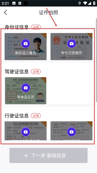 4、请按顺序上传身份证人像面、国徽面以及驾驶证、行驶证的照片,以此完成认证所需证件信息的提交。