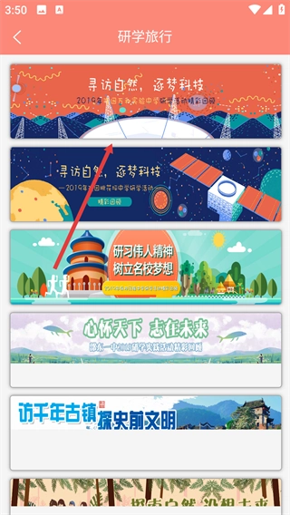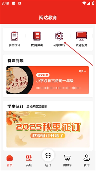 1、打开阅达教育首页后,点击页面顶部的【研学旅行】选项。