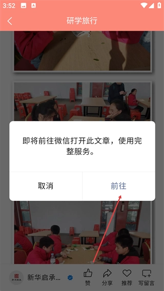 4、弹出提示框后,点击【前往】按钮,即可跳转至微信端体验该文章的完整服务。