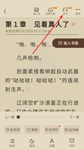 3、进入阅读界面,点击右上角的听书按钮进行听书