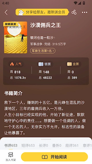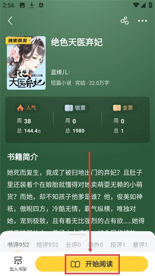 4、在详情页查看简介后,点击底部的【开始阅读】按钮,即可进入书籍的阅读界面。