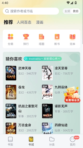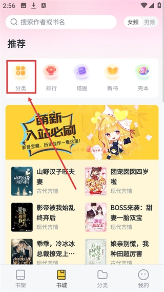 1、进入书城页面后,点击顶部的【分类】选项,即可进入书籍分类页面,在该页面能够按照类别对书籍进行筛选。