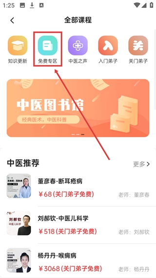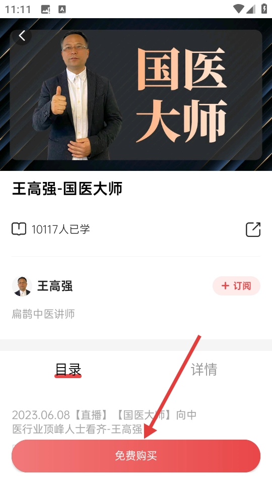 2、进入免费专区页面后,找到目标课程(例如【王高强-国医大师】)并点击,即可进入该课程的详情页面。