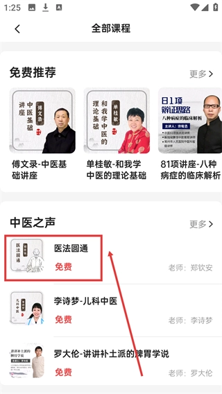 3、进入免费专区页面后,点击【医法圆通】课程,即可进入该课程的详情页面。