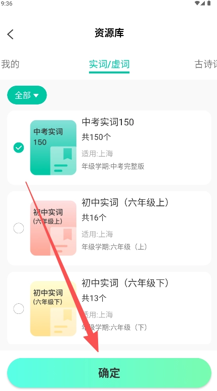 2、在资源库顶部找到“实词/虚词”选项卡,切换至该选项卡即可查看对应的学习资源列表。