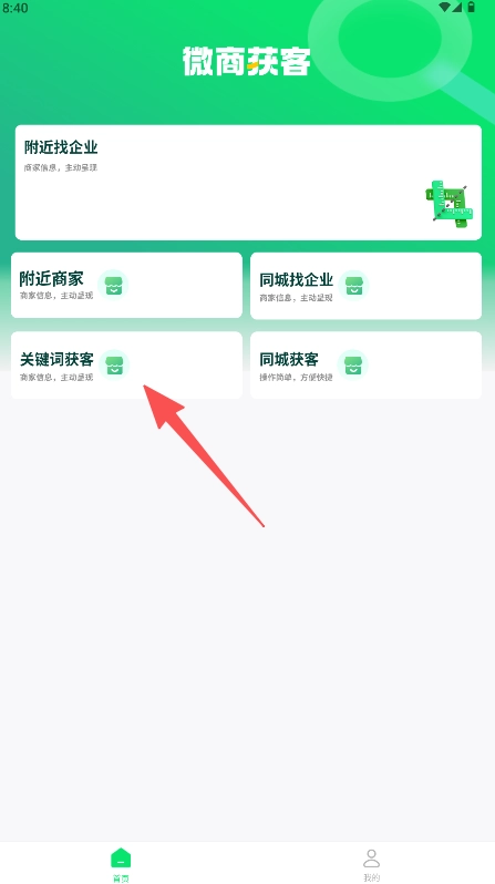 1、在主界面功能区点击“关键词获客”选项进入功能页面。