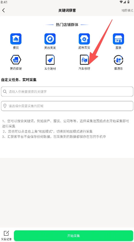 2、目标客户筛选逻辑围绕行业分类与关键词展开。可按汽车修理、教育培训等具体行业类别查找商家。