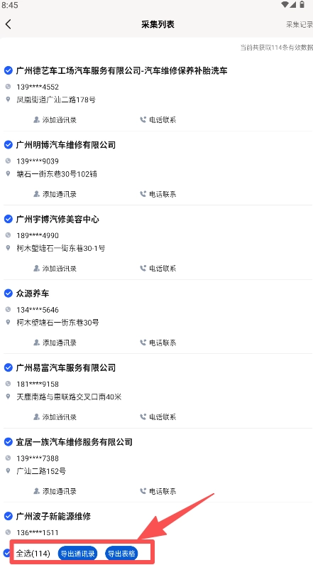 3、在采集到的商家列表页,可点击“导出通讯录”或“导出表格”保存数据。