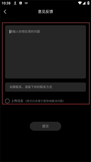 4、进入意见反馈页面后,填写需要反馈的问题详情,还能补充联系方式、选择上传日志,全部完成后点击“提交”按钮就能发送反馈信息。