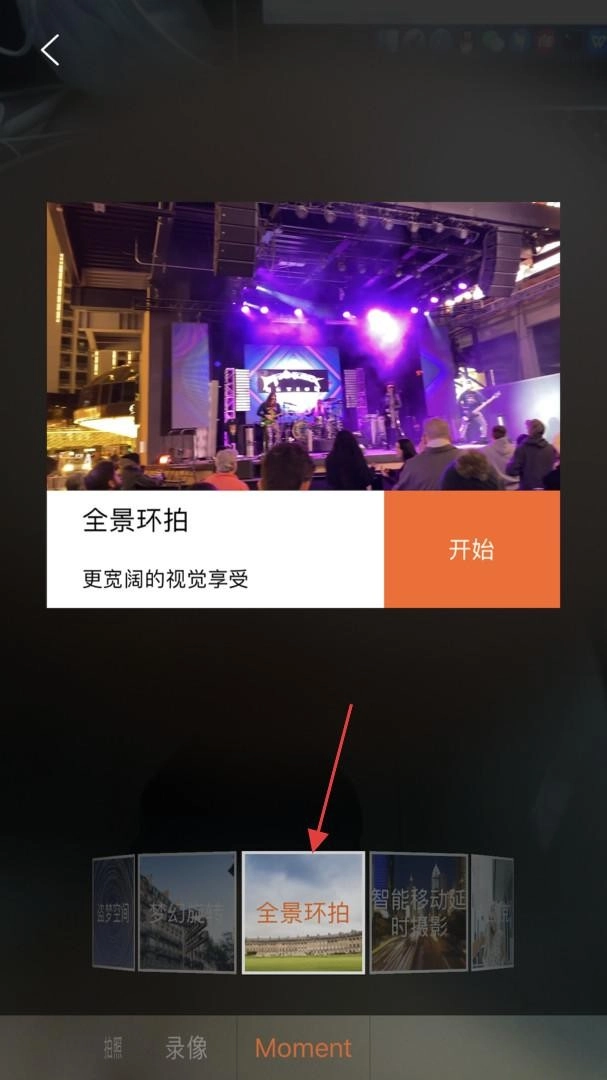2、进入拍摄界面后,轻点“全景环拍”选项,接着点击“开始”按钮,即可执行全景环拍操作,从而获取视野更开阔的画面效果。