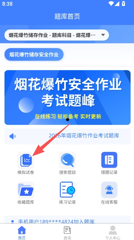 1、聚焦烟花爆竹安全作业考试,设题库首页对应科目板块,含模拟试卷搜索题目等功能。