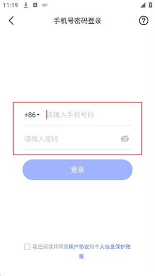 4、在手机号码密码登录页面,输入已注册的手机号码和对应密码,勾选用户协议后点击“登录”按钮,即可完成账号登录。