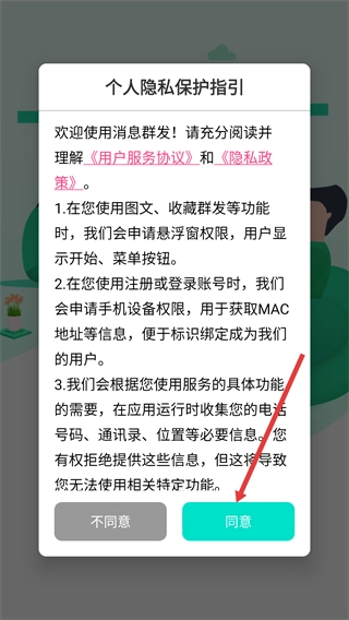1、阅读【个人隐私保护指引】里的【用户服务协议】-【隐私政策】,了解权限说明后,点击【同意】按钮进入软件主界面。