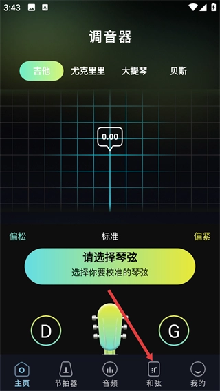 1、在【调音器】页面(支持【吉他】-【尤克里里】等乐器),点击底部的【和弦】选项,即可进入和弦相关功能页面。