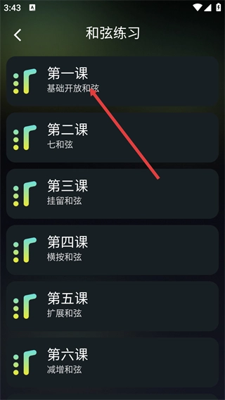 3、在【和弦练习】的课程列表里,找到并点击【第一课-基础开放和弦】这个选项,就能进入该课程对应的具体和弦学习页面。