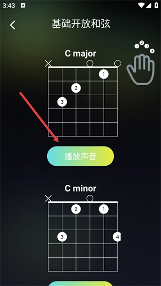 4、进入【基础开放和弦】页面,能够查看【C-major】等和弦的指法,点击【播放声音】按钮,即可收听到对应和弦的音效。