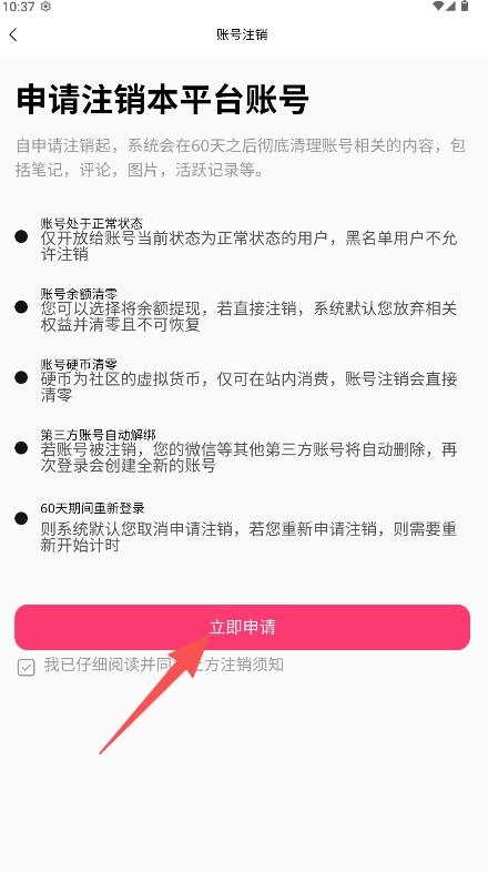 3、仔细阅读注销须知后勾选同意,并点击底部“立即申请”按钮完成操作。