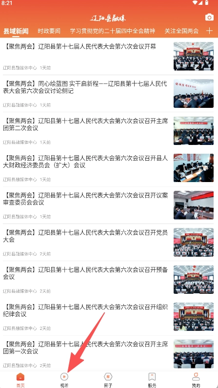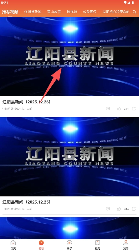 2、在视听板块浏览并点击感兴趣的新闻(如“辽阳县新闻”)观看。