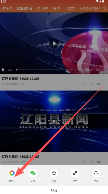 3、在新闻播放页面点击分享按钮,在弹出的选项中选择“朋友圈”图标进行分享。