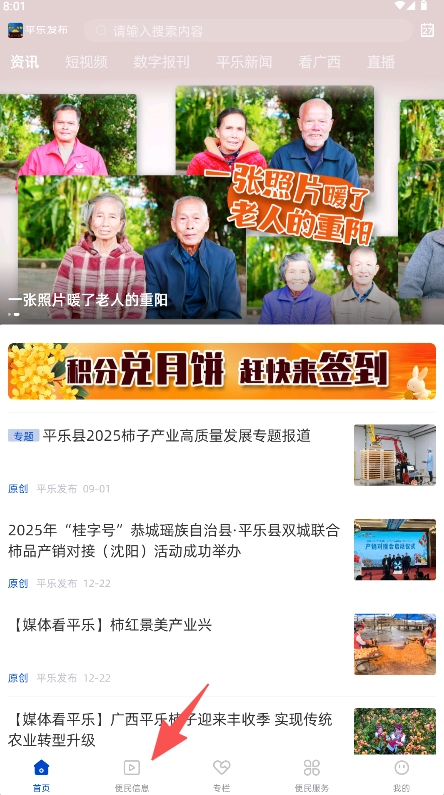 1、在首页底部导航栏点击“便民信息”按钮进入对应板块。