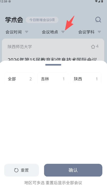 2、在首页找到“会议地点”筛选框,点击展开后进入地区选择界面。