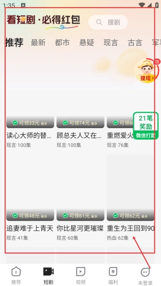 1、进入看短剧必得红包页面,可选择【推荐等分类】,观看短剧可领对应红包。