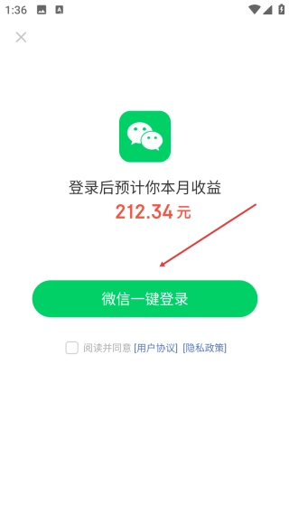 2、在登录页面,勾选协议后选择【微信一键登录】,可登录账号查看本月预计收益。