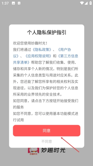 3、进入个人隐私保护指引页,点击【同意】按钮,接受服务并使用完整功能。