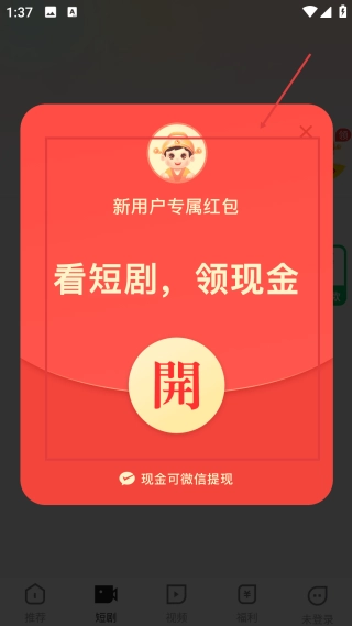 4、在新用户专属红包弹窗,点击【開】按钮,可领取看短剧对应的现金红包奖励。