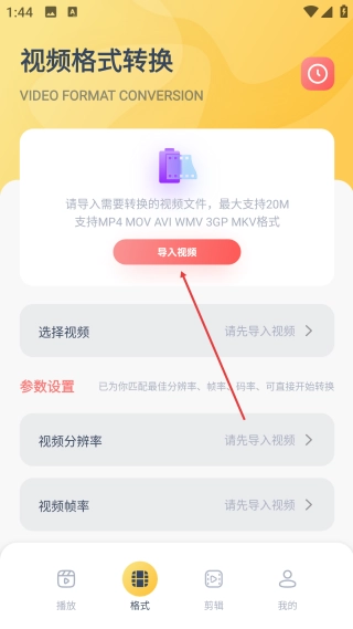 2、在视频格式转换页,点击【导入视频】按钮进入视频选择页面。