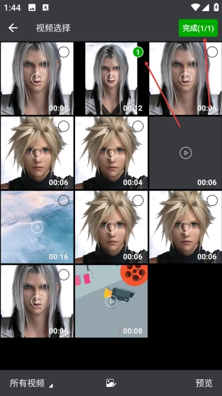 3、在视频选择页,选中【目标视频】后点击右上角【完成】按钮。