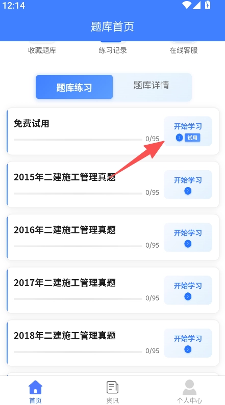 2、在题库练习页面,点击免费试用的开始学习按钮。