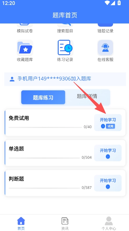 1、具备练习启动功能,进入题库首页点击免费试用的开始学习,进入对应练习页面。