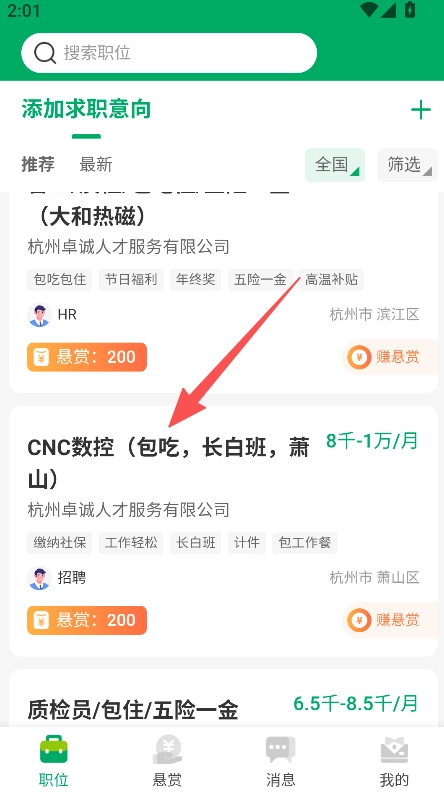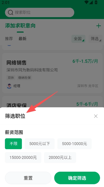1、具备职位筛选功能,进入页面点击筛选职位,选择对应薪资范围完成职位筛选操作。