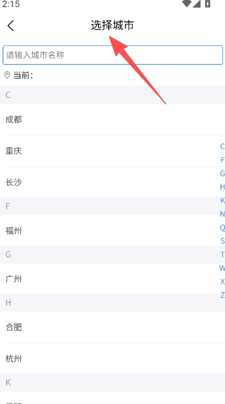 1、打开软件进入选择城市页面,输入城市名称选择对应城市。