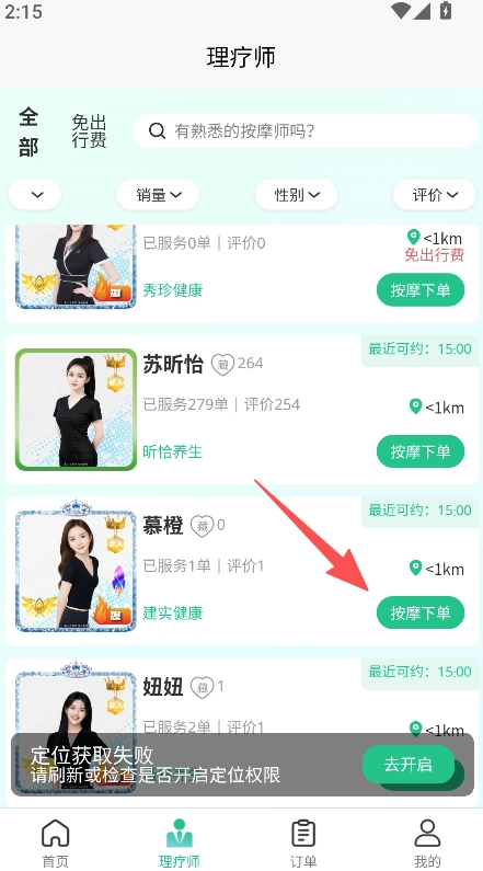 2、进入理疗师板块,选择目标理疗师点击按摩下单按钮。