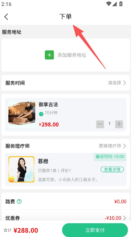 2、支持理疗师选择功能,在理疗师板块点击目标理疗师的按摩下单按钮,进入订单页面。