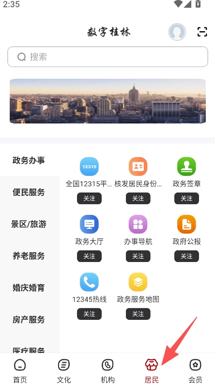 1、具备板块切换功能,进入页面点击居民,切换至含多分类的服务资讯页面。