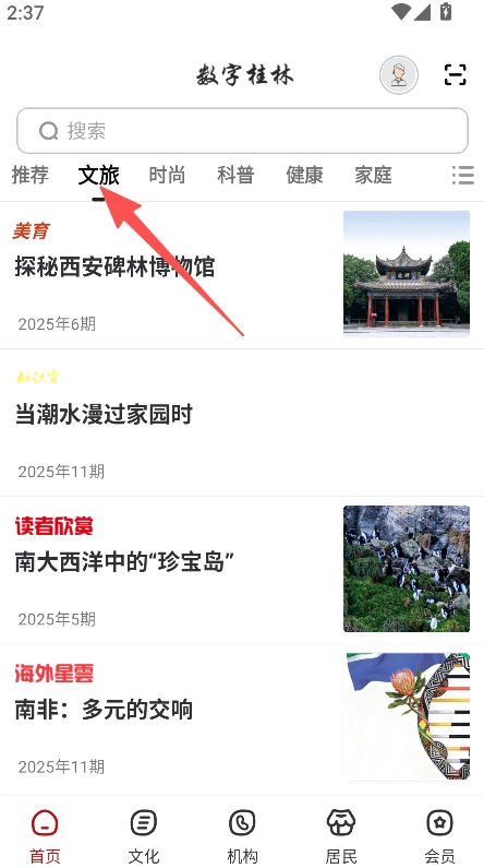 2、居民页面分文旅时尚等分类,展示各类文章标注期数,清晰呈现内容属性与发布节奏。