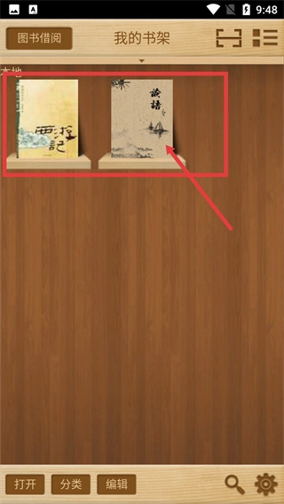 1、进入【我的书架】页面,可看到已添加的书籍列表,找到《论语》书籍并点击,进入该书籍的阅读界面。