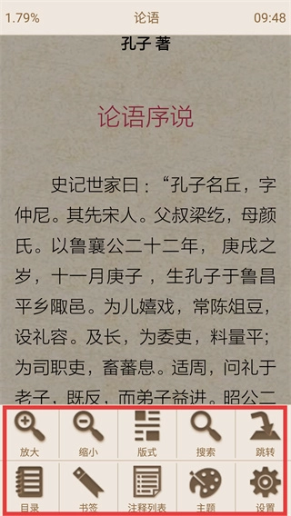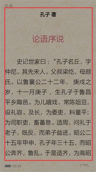 2、点击《论语》后进入阅读界面,可查看书籍内容,当前展示的是《论语序说》部分的文字信息。