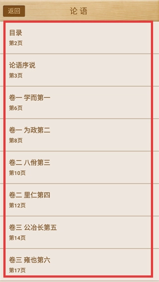 4、点击功能栏里的【目录】选项,进入《论语》的目录页面,可查看各章节对应的页码,便于跳转至目标章节阅读。